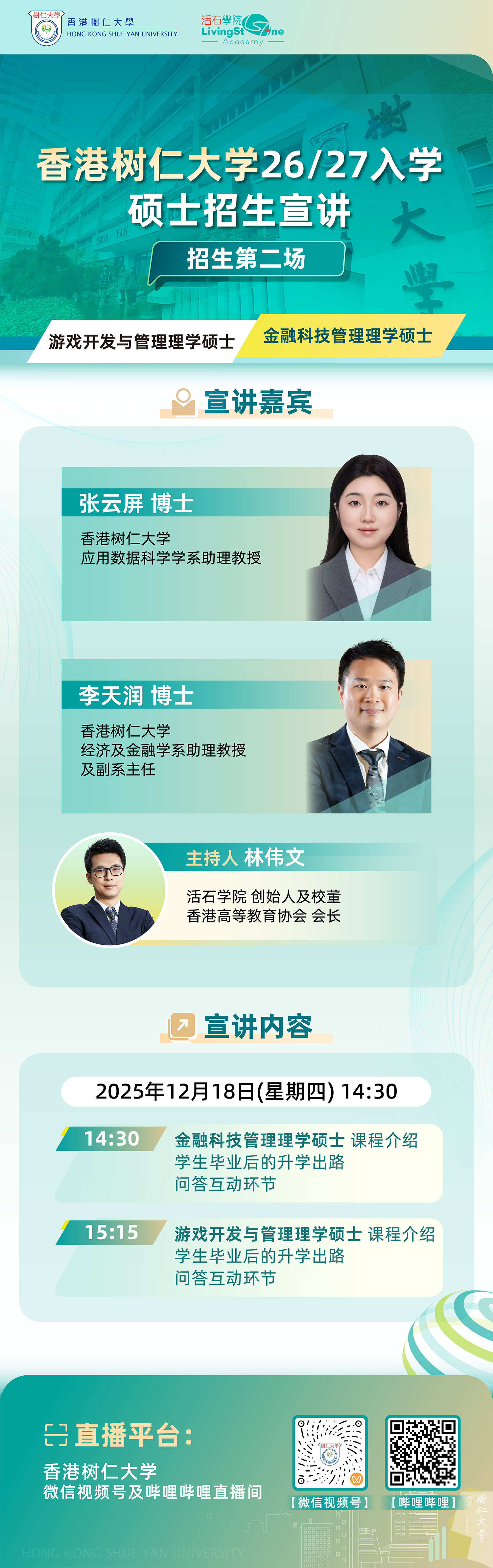 仁大將於12月18日(星期四) 舉行線上招生宣講會,由學系教授介紹「遊戲開發與管理理學碩士」及「金融科技管理理學碩士」兩個課程特色及申請入學要點,並設有問答環節。誠邀各位屆時參與。